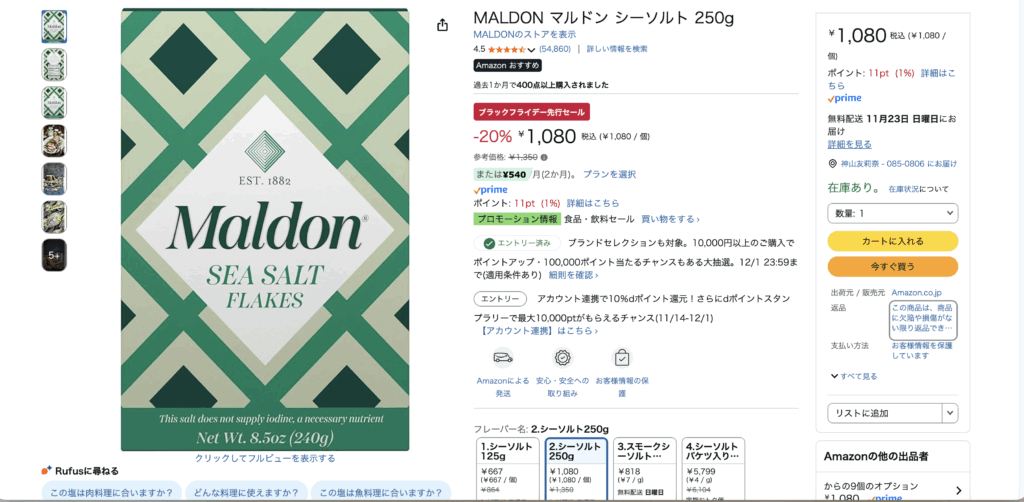 1つ目は1度使ってからファンになってしまった「マルドン シーソルト 250g 」!