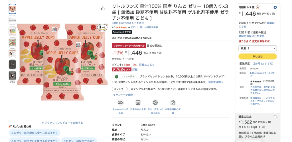 11.リトルワンズ 果汁100% 国産 りんごゼリー 10個×3袋 1,446円