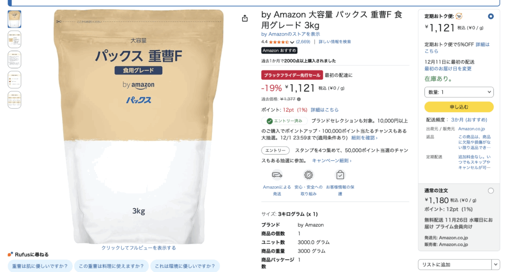 12.by Amazon 大容量 パックス 重曹 3kg 1,121円