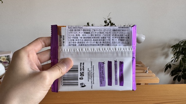 甘すぎない、デーツの自然な甘さと、ピーナツやオーツ麦の香りや食感が楽しめるうえ、罪悪感がないのが最高で、後味のこの香ばしい感じも大好き。(後味がちょこあ〜んぱんに似てる…)