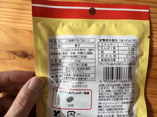 レジ横にあったのを夫が「それも買う!」とカートに追加したのが、「三温糖きなこねじり」です。