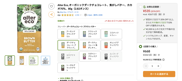 3つ目のiHerbベストバイは「Alter Eco, オーガニックダークチョコレート、焦がしバター、カカオ70%」です!