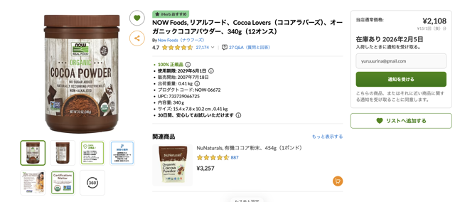 1つ目に紹介するのが「NOW Foods オーガニックココアパウダー」!