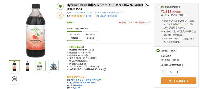 ②Dynamic Health, 濃縮タルトチェリー、ガラス瓶入り、473ml 2,266円