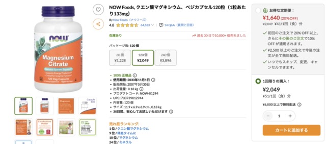 ⑤NOW Foods, クエン酸マグネシウム120粒 2,049円
