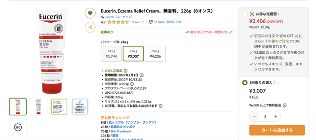 ⑨Eucerin, Eczema Relief Cream、無香料、226g 3,007円