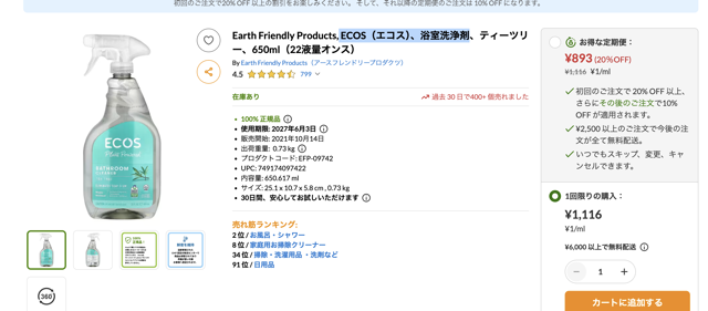 13. ECOS(エコス)、浴室洗浄剤 650ml 1,116円