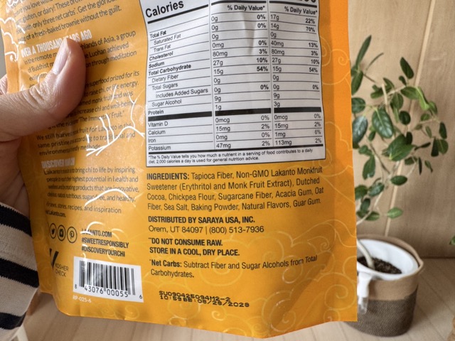タピオカ繊維、 遺伝子組み換えでないLakanto(ラカント)羅漢果甘味料(エリトリトールと羅漢果エキス)、 ダッチココア、 ヒヨコ豆粉、 サトウキビ繊維、 アカシアガム、 オーツ麦繊維、 海塩、 ベーキングパウダー、 グアーガム、 天然香料。