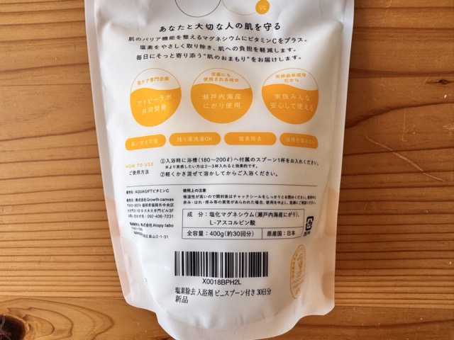 L-アスコルビン酸(ビタミンC)が入っているので、塩素除去もしてくれるうえ、塩化マグネシウム浴を楽しめます。