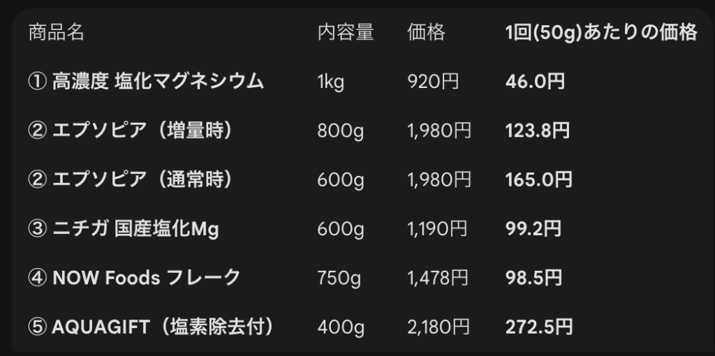 パッケージに1回分は大さじ1程度と書かれている商品もあるので、その場合は一回あたりの価格を抑えられますが…高濃度塩化マグネシウムは50g使っても46円というコスパの良さなので、他と比べてそのすごさにより驚きました🥹✨
