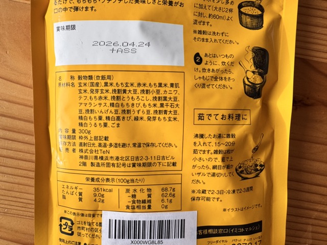 原材料は次のとおりで、麦類を一切使わず、テフやカニワ、アマランサスなどのスーパーフードが入っているグルテンフリーの雑穀米です!